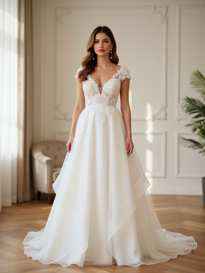 A-Line Organza Wedding Dress with Lace-V-neck-Court Train