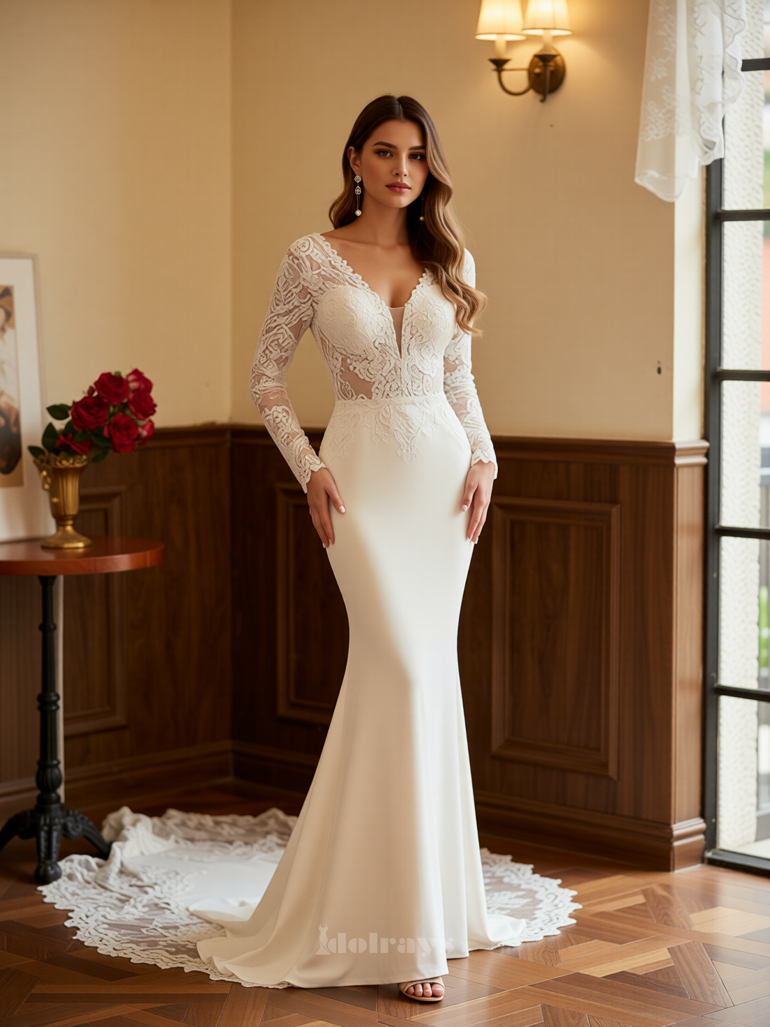 Timeless Long Sleeves & Lace: Features sophisticated Long Sleeves accented with exquisite Lace embellishments, offering a modest yet alluring aesthetic that radiates classic bridal charm.
